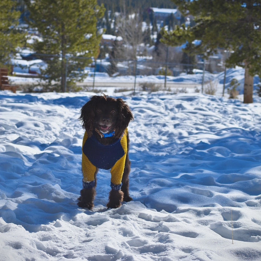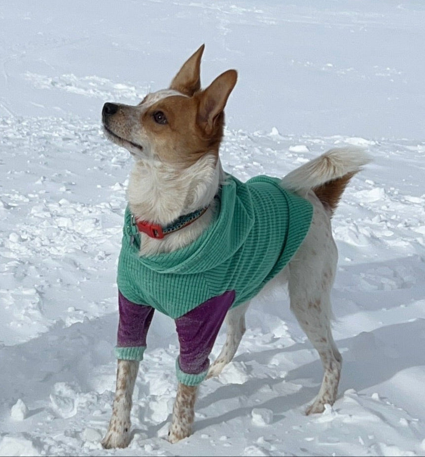 We are an active family that spends a lot of time outside with our dogs. I wanted to make something to keep my dogs warm and cozy without being bulky. I also wanted to bring a little mountain style to the pieces. So I sat down at the sewing machine and started to create. The hoodies are made from a mix of materials, including fleece, upcycled cycling jerseys and other previously loved garments. Each piece is unique and handcrafted. I love the hoodies that have come from this and I hope you and your furry friends do as well.